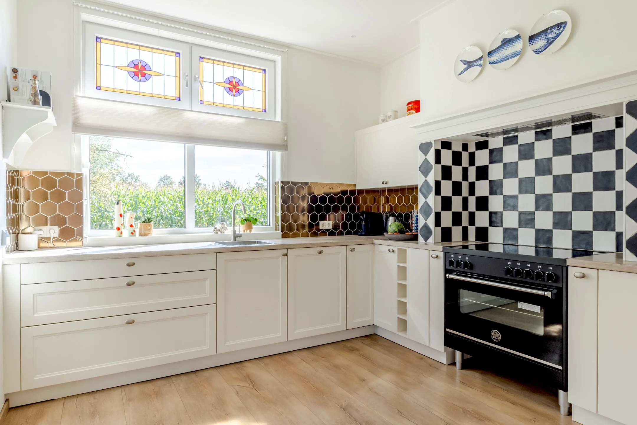 Je stapt binnen via een sfeervolle hal met authentieke tegelvloer en extra brede trapopgang. De woonkamer is licht met openslaande deuren naar het terras en staat in open verbinding met de keuken welke is gemoderniseerd en voorzien van een fornuis met inductiekookplaat, oven, vaatwasser en koelkast. De badkamer is luxe en eigentijds uitgevoerd met een wastafelmeubel, ligbad en een royale inloopdouche. In de bijkeuken vind je het moderne toilet, de aansluiting voor wasmachine en de opstelling van de CV-ketel. Zowel de woonkamer, keuken, het halletje als de badkamer zijn voorzien van vloerverwarming.